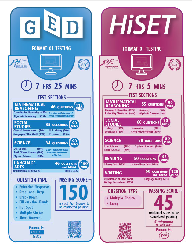 California has approved the use of the GED® and HiSET® high school equivalency tests for students 18 years old and older for the purpose of receiving a California High School Equivalency Certificate. The GED and HiSET subjects exams are offered in English or in Spanish. ABC Adult School offers preparation and testing for both the GED and HiSET exams in English and Spanish.