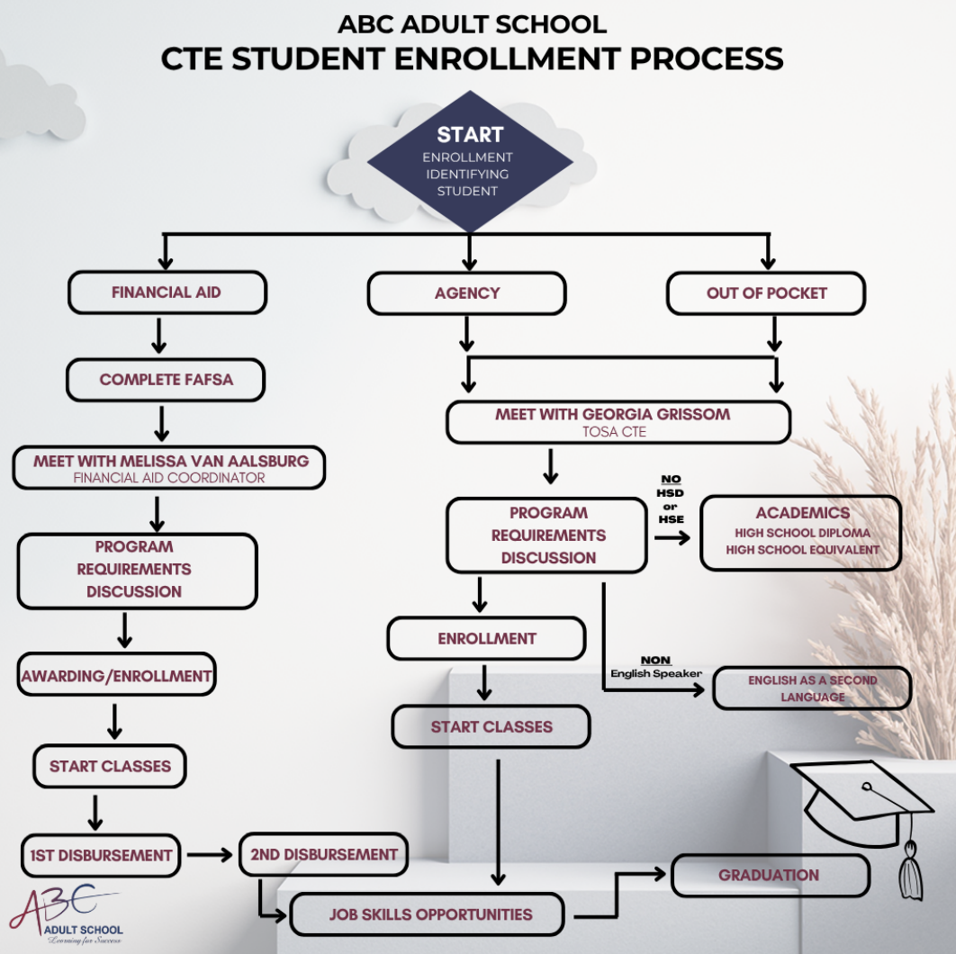 Transfer from another institution – ABC Adult School does not transfer “credits” from other educational institutions. Students who have taken classes similar to those listed for a Career Technical Diploma will be required to participate in a written or practical examination to demonstrate their skills level for the following prerequisite courses in the program: Computer Essentials A and B and Keyboarding. All other courses in the program must be taken at ABC Adult School to earn a Career Technical Diploma. Student placement into a program will be at the discretion of the lead instructor and administration based on the outcome of the above stated items. Fees will be appropriately prorated.